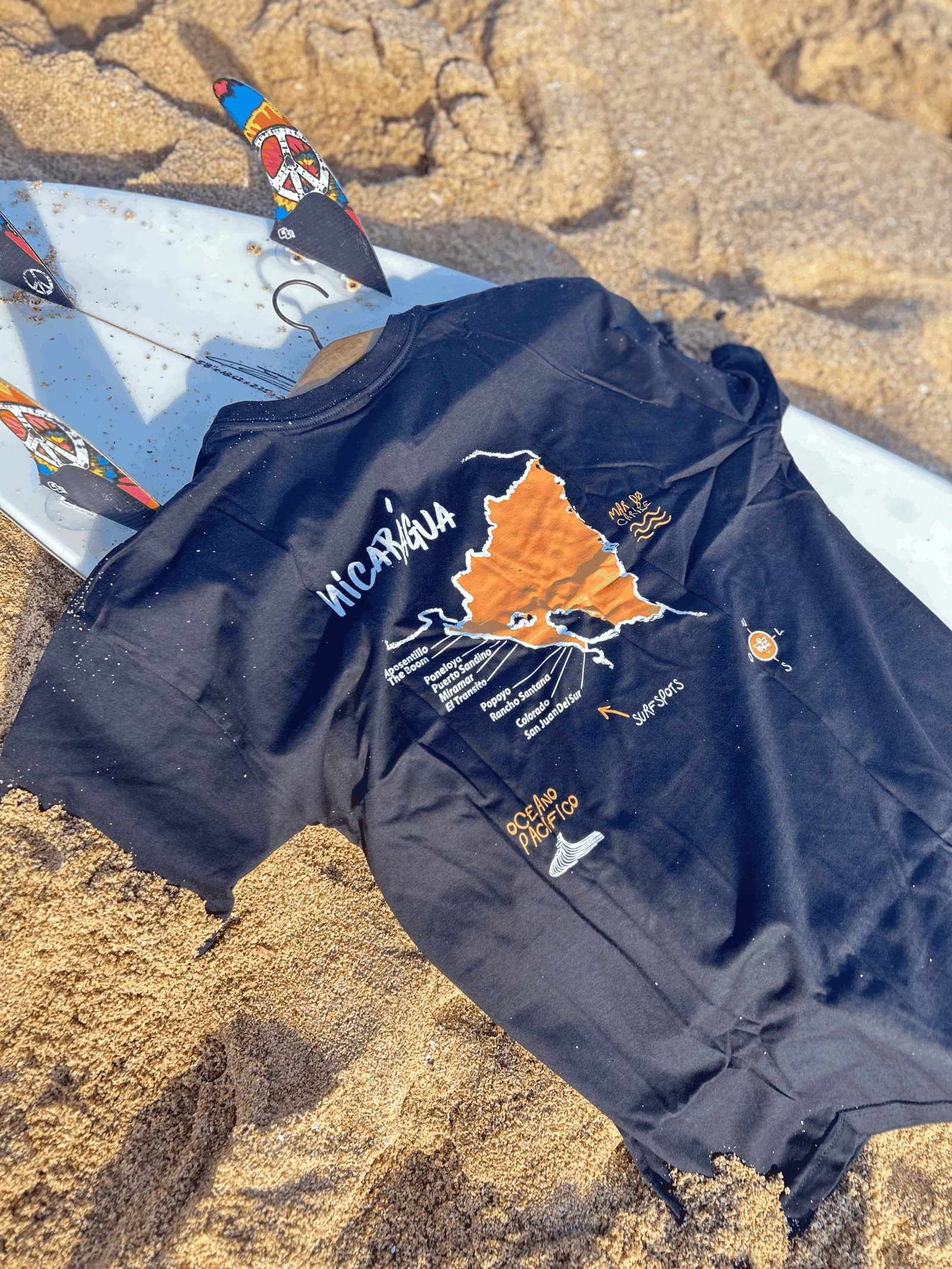Camisa Surf Trips Nicarágua traz o logo Surf Trips Nicarágua em laranja. Já nas costas, o destaque vai para o mapa ilustrado da Nicarágua, com os principais surf spots do local.